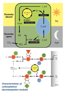 Crassulacean acid metabolism (CAM) is a photosynthetic CO2 fixation pathway that maximizes water use efficiency (WUE) many times relative to C3 species by using a temporal CO2 pump. Thus, CAM provides an excellent opportunity to engineer both enhanced photosynthetic performance and WUE into bioenergy crops. The proposed research will provide a comprehensive understanding of the enzymatic and regulatory pathways required to engineer CAM photosynthetic machinery into Populus. The methods employed will include deep transcriptome sequencing (RNA-Seq) and high-throughput metabolic profiling of leaf mesophyll cells and stomatal guard cells to identify regulators of the nocturnal opening and daytime closure of stomata that underpins the high WUE of CAM plants in order to create co-expression models. Additional deep genome sequencing combined with chromatin-immunoprecipitation (ChIP-Seq) experiments will be conducted to characterize the transcriptional regulatory networks needed for the circadian clock regulation of CAM. Once characterized, metabolic pathway components of 'carboxylation' and 'decarboxylation' modules will be assembled using an iterative cloning system, and CAM modules will be assembled singly and in combination into a predefined single locus of the target plant genome. Modules will be expressed under the control of circadian clock controlled, drought-inducible promoters in both the readily transformable model Arabidopsis and the important bioenergy crop Populus to promote maximal productivity. Resulting plants will be tested under both control and drought stress conditions for transgene expression, biochemical signatures of CAM, CO2 assimilation, stomatal conductance and transpiration rates, leaf carbon balance, level/mode of CAM activity, biomass productivity and quality, and integrated WUE.